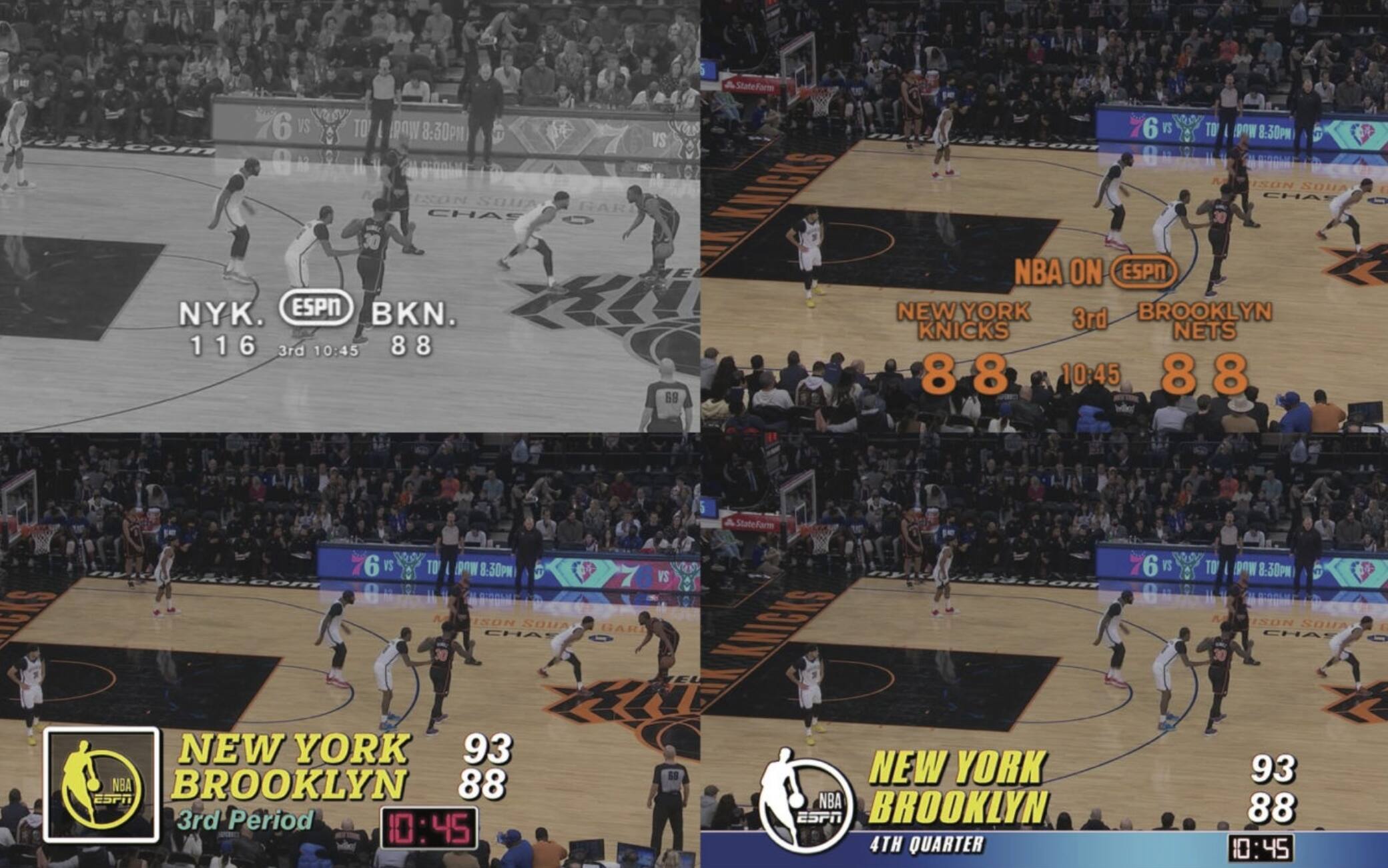 la ricorrenzaUn tuffo nel passato che ha fatto felici i nostalgici NBA: per il derby di New York - andato in onda sul canale ESPN 2 - sono state usate delle grafiche diverse dal solito, che richiamavano quelle utilizzate dalla lega nel corso di questi 75 anni. Il primo quarto in bianco e nero come negli anni '60, per poi riproporre anche gli stili dei decenni successivi: "È stato uno sforzo non per provare a essere riduttivi, ma per riuscire a essere autentici"
