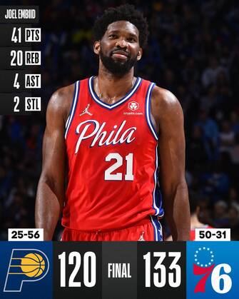 Joel Embiid è semplicemente ingestibile per la difesa dei Pacers. Dopo i 45 punti di pochi giorni fa, la stella dei Sixers ne segna altri 41 con 20 rimbalzi (massimo stagionale), aggiungendo un altro mattoncino alla sua candidatura per l’MVP. Il camerunense guida un quintetto tutto in doppia cifra con James Harden in doppia doppia (22 e 14 assist), insieme ai 18 a testa di Tobias Harris e Tyrese Maxey e i 15 di Danny Green. Ai Pacers non bastano sette giocatori in doppia cifra guidati dai 20 di Oshae Brissett per evitare il nono ko consecutivo