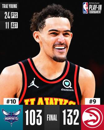 ATLANTA HAWKS-CHARLOTTE HORNETS 132-103 | Successo convincente e senza appello da parte degli Atlanta Hawks che controllano contro gli Charlotte Hornets nel primo tempo e piazzano poi il colpo decisivo nel terzo quarto con il parziale da 42-24 che chiude i conti. Dopo un avvio appannato, Trae Young ritrova mira e canestri e chiude con 24 punti e 11 assist (8/24 dal campo e 1/7 dall’arco) - miglior realizzatore di un quintetto tutto in doppia cifra. Ora l’obiettivo è battere anche Cleveland e conquistare l’accesso al primo turno playoff contro Miami