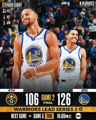 GOLDEN STATE WARRIORS-DENVER NUGGETS 126-106 (SERIE 2-0) | Golden State regola Denver per la seconda volta su due, tenendo a bada i bollenti spiriti di Nikola Jokic e portandosi sul 2-0 nella serie con un’altra prova convincente. Merito del parziale di 16-0 nel secondo quarto per cancellare uno svantaggio di 12 lunghezze e del terzo quarto da 44-30 per volare a +20 e tenere il match sotto controllo, grazie soprattutto alle magie del terzetto Curry-Poole-Thompson capace di segnare 31 dei 52 tiri tentati con 13 triple a segno