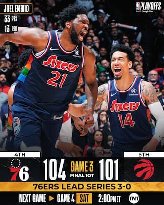 Una tripla di Joel Embiid a 8 decimi dalla fine del supplementare decide gara-3 e probabilmente la serie tra Philadelphia e Toronto in favore dei Sixers, dominata dai 33 punti del candidato MVP. Boston rimonta Brooklyn con un grande ultimo quarto e si porta sul 2-0 nella serie coi Nets, solo 10 punti per Kyrie Irving. DeMar DeRozan firma 41 punti e pareggia la serie coi Bucks che perdono anche Khris Middleton per infortunio