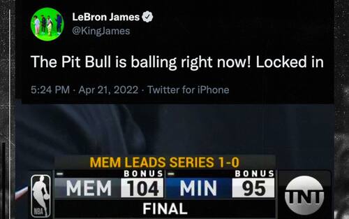 IL GRANDE AVVIO DI GARA DEI T'WOLVES | Il primo tweet della serata di LeBron James è dedicato a Minnesota e alla sua grande partenza nella sfida contro Memphis: un primo tempo in cui i T'Wolves toccano anche le 26 lunghezze di vantaggio, con il n°6 gialloviola che non può fare altro che sottolinearne la resa