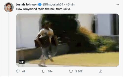 LA GIOCATA DECISIVA DI DRAYMOND GREEN | Chiudiamo con il commento alla palla rubata da Draymond Green nel possesso decisivo della sfida contro Denver, scippata dalle mani di Nikola Jokic: una giocata che ha portato tanti a scherzare e commentare sui social, con tanto di GIF che descrivono in maniera divertente quanto fatto dal n° 32 Warriors