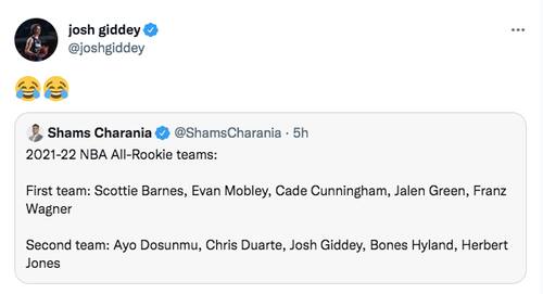 LA DELUSIONE DI JOSH GIDDEY | Sono bastate un paio di faccine che ridono di fronte alla designazione dei quintetti con i migliori rookie dell'anno per far trasparire il suo stato d'animo: l'australiano pensava di poter essere inserito tra i cinque migliori esordienti dell'anno e non sembra avere tutti i torti