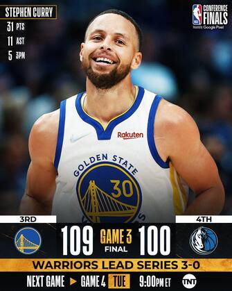 Trascinati dai 31 punti di Steph Curry e dai 27 di Andrew Wiggins, Golden State vince anche gara-3 a Dallas e si porta a un passo dalle Finali NBA andando sul 3-0 nella serie. Klay Thompson aggiunge un paio di triple pesanti nel quarto periodo e rende inutili i 40 punti di Luka Doncic, che subisce una clamorosa schiacciata sulla testa da parte di Wiggins a metà ultimo quarto. Decisivi i 32 errori dalla lunga distanza dei Mavs, che ora hanno davanti un’impresa disperata