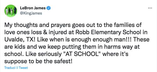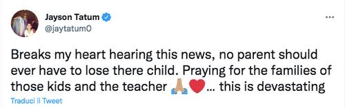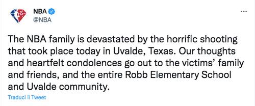 Commozione, cordoglio e trasporto: c'è tutto questo e molto altro nelle parole dei giocatori NBA (e non solo) arrivate a margine della partita playoff tra Dallas e Golden State - passata in secondo piano di fronte alla tragedia che ha colpito una scuola in Texas, dove sono morti decine di bambini. Da Steve Kerr a LeBron James: queste le parole di denuncia e scoramento che alcuni sportivi USA hanno affidato ai social