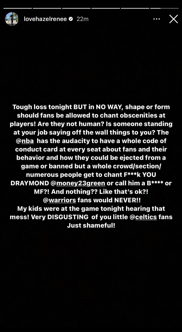 Con un lungo messaggio in una Instagram story pubblicata dal suo account, anche la moglie di Draymond Green, Hazel Renee, è voluta tornare - indignata - sul trattamento riservato dal pubblico del TD Garden al marito: "Ai tifosi non dovrebbe mai essere permesso di gridare e urlare quel tipo di oscenità verso i giocatori. Ma questi tifosi sono umani?", si è chiesta infuriata. "Un intero palazzo, o almeno un'intera sezione, può cantare 'F**k you Draymond' o apostrofarlo con i peggiori insulti e non succede nulla? Sicuri che sia tutto OK? I tifosi degli Warriors non si sarebbero mai comportati così. I miei figli erano all'arena stasera, costretti ad ascoltare questo schifo. Lo trovo disgustoso, miseri tifosi di Boston. Davvero vergognoso!!", ha scritto su IG. Facile previsione: il duello Draymond Green-Boston non è certo finito qui.