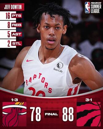 TORONTO RAPTORS-MIAMI HEAT 88-78 | Toronto conferma la buona Summer League di diversi suoi giocatori nella vittoria contro Miami, arrivata grazie ai 18 punti di Dalano Banton, ai 17 di Armoni Brooks, ai 16 con 8 rimbalzi di Jeff Dowtin e ai 14 di Ron Harper Jr., mentre non va oltre i 6 punt con 2/5 al tiro il rookie di Arizona Christian Koloko. Kyle Allman è il migliore per Miami con 17 punti, si segnala anche la doppia doppia (13+11 rimbalzi) di Orlando Robinson