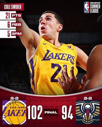 NEW ORLEANS PELICANS-LOS ANGELES LAKERS 94-102 | I Lakers vincono la sfida contro i Pelicans grazie ai 21 punti di Cole Swider e ai 14 punti con 7 assist di Javante McCoy (7 assist li distribuisce anche Scotty Pippen Jr., insieme a 11 punti). Non bastano a New Orleans i 20 punti di Jared Harper e i 17 dalla panchina di Deividas Syrvidis