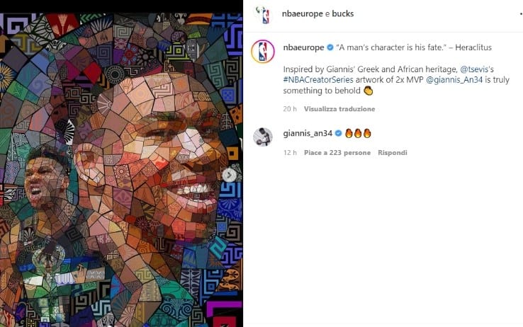 Per celebrare il proprio 75° compleanno, la NBA ha commissionato ad alcuni artisti/illustratori di tutta Europa (tra Francia e Grecia, tra Italia e Spagna ma anche Regno Unito) delle opere originali che celebrino l'unione sempre più stretta tra la pallacanestro europea e il mondo del basket americano. Facile per Charis Tsevis, visual designer, illustratore e art director, ispirarsi allora all'idolo di casa Giannis Antetokounmpo: "Lui per me è un vero e proprio eroe. È nato e cresciuto nel mio stesso quartiere. So quanto sia difficile quella zona, soprattutto per una famiglia di immigrati nigeriani. Ha affrontato sfide difficili, che ha superato una dopo l'altra con grande classe. È ancora una persona incredibilmente umile che mostra un carattere solido. Non si tratta solo di basket. Tutto ciò che Giannis fa, anche i più piccoli dettagli, dimostra una persona incredibilmente educata e saggia. Sta davvero onorando la citazione di Eraclito in modo molto positivo".
