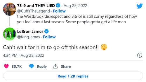 IL COMMENTO DEL "RE" | Nelle ultime ore, infatti, non è passata inosservata la risposta data via Twitter da LeBron James in una discussione che per l'ennesima volta evidenziava una mancanza di rispetto per il n°0 gialloviola, giocatore capace di essere MVP NBA nella sua carriera oltre che miglior realizzatore e passatore. Ma se il commento di James è sembrato un endorsement alla presenza anche futura di Westbrook in gialloviola ("Non vedo l'ora che quest'anno si scateni"), Buha disegna due scenari completamente diversi per il futuro del giocatore