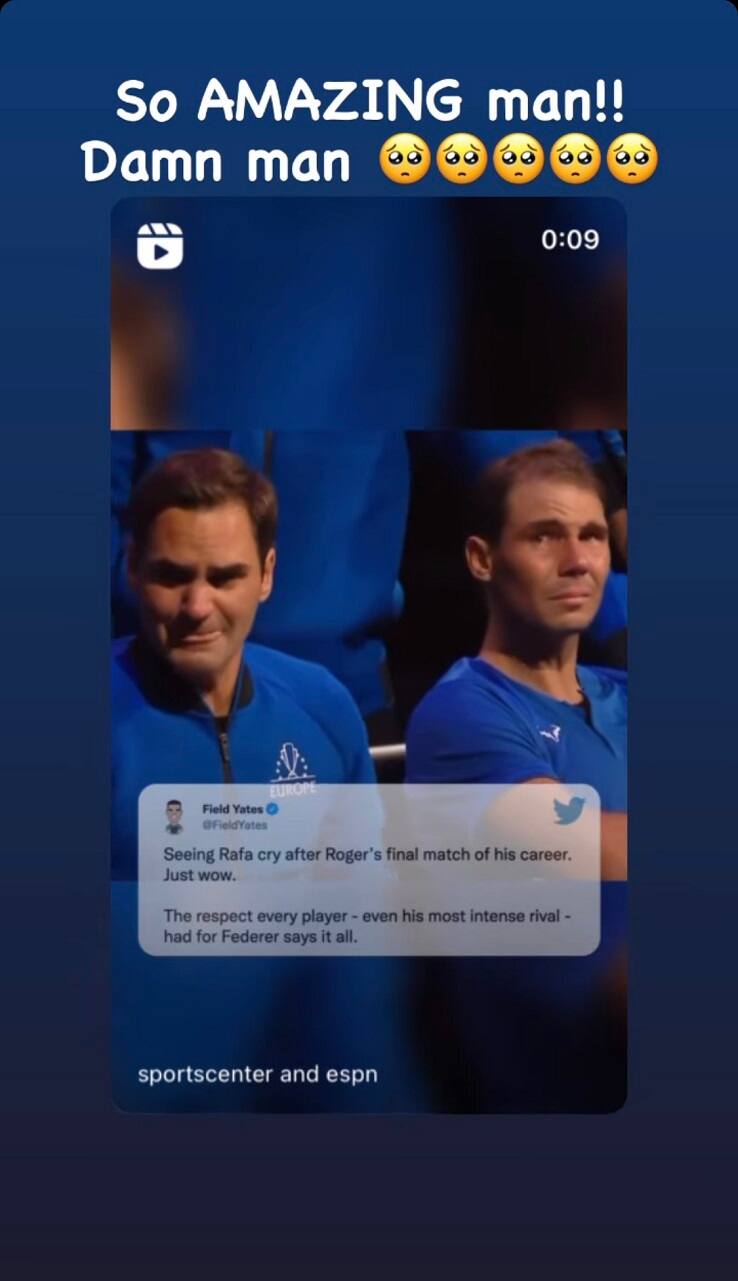 "King Roger" (Federer) lascia per sempre il tennis, e allora anche "King James" (LeBron) non può mancare di esprimere tutta la sua ammirazione per il campione svizzero. Lo fa dedidcando alle lacrime di Federer e del suo ultimo avversario, Rafa Nada, una Instagram story: "È così fantastico!". E poi aggiunge: "Dannazione", esclamazione seguita da cinque faccine tristi. Neppure LeBron vuole vedere Roger Federer dire addio ai campi