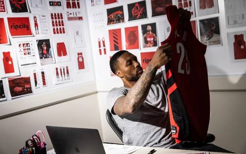 STILISTA & MODELLO | Dopo aver contribuito alla creazione delle nuove divise, Lillard si presta anche a fare da modello e a indossare le nuove maglie, appena prodotte. Eccolo in due scatti che danno un'idea dell'impatto visivo delle maglie, come si vedranno in campo