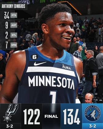 MINNESOTA TIMBERWOLVES-SAN ANTONIO SPURS 134-122 | Bastano due giorni ai T’Wolves per scrollarsi di dosso la pesante sconfitta contro gli Spurs e prendersi il successo in un match da 20 triple a bersaglio di squadra (record stagionale) - ottimo segnale di salute per un roster che fatica con i piedi oltre l’arco - e nel quale agli ospiti non bastano i 27 punti realizzati da Keldon Johnson; orfani degli infortunati Joshua Primo e Devin Vassell