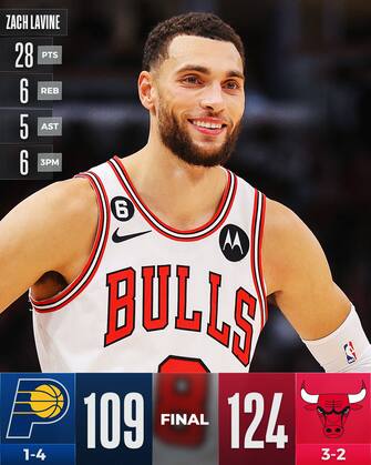 CHICAGO BULLS-INDIANA PACERS 124-109 | I Bulls resistono al tentativo di rimonta dei Pacers (tornati da -24 fino al -4) e ringraziano Zach LaVine, autore di 28 punti tra cui una tripla decisiva per spegnere ogni speranza degli ospiti, arrivati alla quarta sconfitta in cinque partite. DeMar DeRozan segna 17 punti e manca l’aggancio a quota 20.000 (ora gliene mancano 7), mentre Indiana riabbraccia Myles Turner (5 punti e 4 stoppate in 24 minuti) e ha 25 punti da Buddy Hield, autore di un ottimo 7/12 da tre