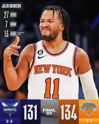 NEW YORK KNICKS-CHARLOTTE HORNETS 134-131 OT | Terza vittoria su tre in casa per i Knicks, che hanno bisogno di un tempo supplementare per avere ragione dei combattivi Hornets. Merito di un ottimo Jalen Brunson, il migliore dei suoi con 27 punti, 7 rimbalzi e 13 assist, seguito dai 22 di RJ Barrett (tra cui i due liberi per il +3 a 3 secondi dalla fine) per la miglior partenza di New York da 10 anni a questa parte. Agli ospiti non bastano i 21 di Gordon Hayward, sprecando un vantaggio di 5 lunghezze a due minuti dalla fine dei regolamentari