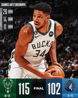 MINNESOTA TIMBERWOLVES-MILWAUKEE BUCKS 102-115 | La miglior partenza nella storia dei Bucks arriva con l'ottava vittoria in fila firmata Antetokounmpo (in tripla doppia)-Holiday (29 punti, 8 rimbalzi e 6 assist). Allungo Milwaukee sul +22 già nel terzo quarto, poi rimonta di Minnesota fino al -8 ma il finale è ancora tutto degli ospiti, che sfiorano il 45% da tre punti (17/38) e hanno dalla panchina i 18 punti di Portis e i 14 del rookie Beauchamp. Terzo ko in fila per i T'Wolves: non bastano i 24 di Edwards e i 22+11 rimbalzi di Towns