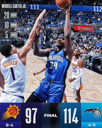 ORLANDO MAGIC-PHOENIX SUNS 114-97 | Banchero ancora non c'è (caviglia), così come non ci sono Chris Paul e Cam Johnson a Phoenix, ma Orlando centra il secondo successo consecutivo per la prima volta in stagione, grazie alle doppie doppie di Wendell Carter Jr. (20+10 rimbalzi) e di Bol Bol, che a 13 punti aggiunge 15 rimbalzi, suo massimo in carriera. La differenza la fanno le percentuali: Phoenix tira il 40% dal campo e il 31% da tre (Payne il migliore con 22 punti), Orlando va oltre il 52% al tiro con il 45.5% dalla lunga distanza