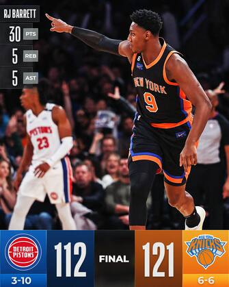 A vincere sono dunque i Knicks - secondo successo nelle ultime tre - guidati dal terzetto di riferimento del proprio quintetto: 30 punti per RJ Barrett con 10/17 al tiro, 26 con il 50% dal campo e 7 assist per Jalen Brunson sempre più a suo agio con la squadra di NY e infine un Julius Randle che non fa mai canestro da lontano (0/7), ma realizza lo stesso 21 punti con 8 rimbalzi e 5 assist