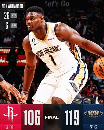 NEW ORLEANS PELICANS-HOUSTON ROCKETS 119-106 | Zion Williamson segna 26 punti con 6 assist e un quasi perfetto 8/9 al tiro, Brandon Ingram ne aggiunge 20 con tanto di sei punti in fila nel 13-0 di parziale che negli ultimi 130 secondi di partita regala ai Pelicans la settima vittoria stagionale. Fondamentale anche l’apporto in uscita dalla panchina di Larry Nance Jr.: 22 punti, 9 rimbalzi e 8/10 al tiro, con New Orleans che nei pressi del ferro ha sbagliato pochissimo