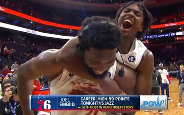 Dire una prestazione che entra nella storia stavolta non è un'eserazione: contro Utah Joel Embiid si regala una serata da massimo in carriera con 59 punti ma ci aggiunge anche 11 rimbalzi, 8 assist e 7 stoppate (ma anche zero palle perse). Da quando è stato introdotto il conteggio di queste ultime (nella stagione 1973-74) nessuno mai aveva avuto una gara con almeno 50 punti, 10 rimbalzi, 5 assist e 5 stoppate, in una prestazione che ha visto il centro di Philadelphia segnare 26 dei 27 punti di squadra nel quarto quarto. Se i 59 punti sono il massimo da lui mai realizzato nel corso della sua carriera (dopo averne messi 42 nella gara precedente contro Atlanta), Embiid diventa titolare della quinta miglior prestazione realizzativa nella storia dei 76ers, dietro soltanto a una tripletta di Wilt Chamberlain (68, 65 e 62 punti segnati tra il 1966 e il 1967) e ai 60 mandati a segno da Allen Iverson nel febbraio 2005.