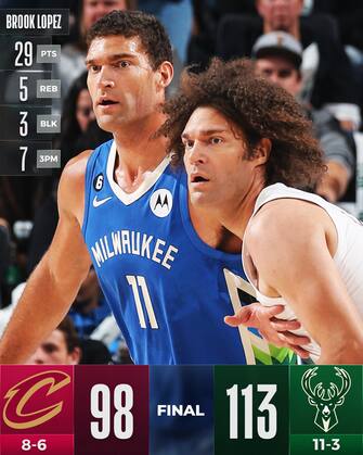 MILWAUKEE BUCKS-CLEVELAND CAVALIERS 113-98 | Dopo lo spettacolare inizio di stagione, i Cavs incassano la quinta sconfitta in fila contro un avversario complicato come i Bucks - travolti in un terzo quarto da 34-18 di parziale e battuti nonostante i 23 punti a testa firmati dal duo Mitchell-Garland. Determinante il contributo della panchina (40-25 in favore dei padroni di casa), che si godono anche un Brook Lopez da 29 punti e 7/9 dall’arco, a cui si aggiunge un Giannis Antetokounmpo da 16 punti, 12 rimbalzi e 8 assist