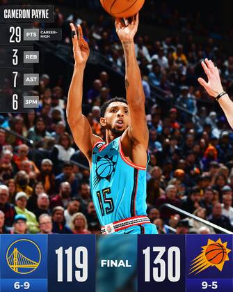 PHOENIX SUNS-GOLDEN STATE WARRIORS 130-119 | Probabilmente il punto più basso di questo complicato primo mese di stagione per gli Warriors, battuti in maniera netta (-11 alla fine, ma Phoenix ha dominato il match) nonostante uno Steph Curry straripante. Merito di un quintetto tutto in doppia cifra per i Suns, che tirano con il 51% dal campo, il 52% dall’arco (21-40 complessivo) e si godono i 27 punti di Booker, i 29 con 6/10 da lontano di Payne e i 23 con 9 rimbalzi e 9 assist di Mikal Bridges. I padroni di casa si confermano quindi la squadra da battere a Ovest