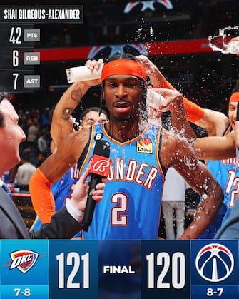 WASHINGTON WIZARDS-OKLAHOMA CITY THUNDER 120-121 | Finale combattuto e spettacolare tra Thunder e Wizards, con OKC che si prende la vittoria grazie alla tripla di Shai Gilgeous-Alexander realizzata a 1.1 secondi dalla sirena, seguita poi dalla straordinaria lettura difensiva di Lu Dort sull’ultimo possesso di gara - a cui aggiunge 16 punti e 6/12 al tiro. Non basta invece a Washington un quintetto tutto in doppia cifra con 27 punti e 9 rimbalzi di Kristaps Porzingis e 25 con 9/19 al tiro per Bradley Beal (tornato in campo dopo 5 match d’assenza)