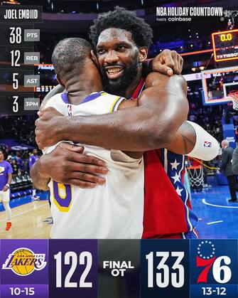 PHILADELPHIA 76ERS-LOS ANGELES LAKERS 133-122 OT | Philadelphia tocca anche il +18 nel quarto periodo e, soprattutto, è avanti di 9 lunghezze a 34 secondi dalla fine, ma i Lakers realizzano un parziale 10-1 per pareggiare i conti e hanno anche il rimpianto di due tiri liberi sbagliati da Austin Reaves e Anthony Davis rispettivamente a 9 e a 3 secondi dalla fine che avrebbero dato il successo ai gialloviola. Nel supplementare gli ospiti sbagliano i primi 9 tiri e Philadelphia chiude i conti con 9 dei 28 punti di James Harden