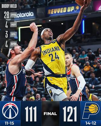 INDIANA PACERS-WASHINGTON WIZARDS 121-111 | Buddy Hield fissa il suo nuovo massimo in stagione a quota 28 punti, tira 12/19 dal campo e guida Indiana al successo arrivato anche grazie ai 23 punti e 11 assist di Tyrese Haliburton, a conferma dell’ottimo percorso fatto dai Pacers in questa prima fase di stagione. Restano invece beffati gli Wizards, che non riescono a innescare Porzingis nella ripresa (autore di 20 punti con 9/9 al tiro nella prima parte di gara e limitato nel secondo tempo in un match chiuso con 29 e nove rimbalzi a referto)