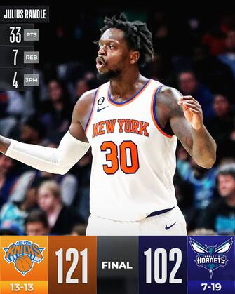 CHARLOTTE HORNETS-NEW YORK KNICKS 102-121 | Terza vittoria in fila per i Knicks che passano con facilità a Charlotte, dilagando in un secondo tempo da 66 punti segnati e approfittando dei sette giocatori in doppia cifra: "È molto divertente quando tutti sono in ritmo: l’energia sul parquet è contagiosa", spiega Randle mentre agli Hornets non bastano i 24 punti di Terry Rozier e i 22 di Kelly Oubre Jr. - inutili nel giorno del suo 27° compleanno (per la settima volta entrambi oltre quota 20 ma con Charlotte ko)