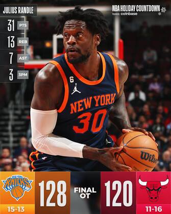 CHICAGO BULLS-NEW YORK KNICKS 120-128 OT | Quinta vittoria in fila per i Knicks che non vogliono smettere di dimostrare di essere una squadra da playoff, rimasti aggrappati al match dopo che Julius Randle aveva mancato il canestro in step-back che sarebbe valso la vittoria della partita dopo 48 minuti e scatenati in un overtime da 11-3 in cui Chicago si ritrova senza energie - propio come accaduto contro Atlanta 48 ore fa. Per i Bulls è il quinto ko nelle ultime sette, scivolati fuori dalla zona play-in a Est