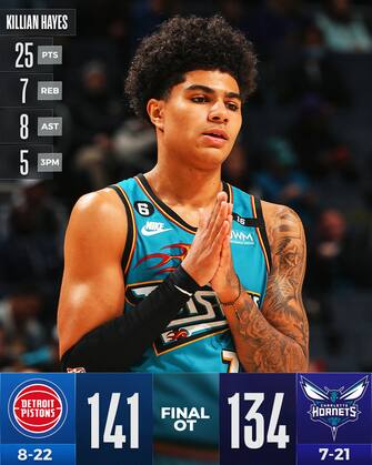 CHARLOTTE HORNETS-DETROIT PISTONS 134-141 OT | I Pistons rovinano il ritorno in campo di LaMelo Ball - autore di 23 punti e 11 assist con 5/13 dall’arco, uscito poi per falli sul finire dei regolamentari - battendo a domicilio gli Hornets dopo un tempo supplementare grazie ai 27 punti in uscita dalla panchina di Alec Burks e ai 25 di un Killian Hayes protagonista in quintetto al posto dell’infortunato Cade Cunningham. Interrotta così da Detroit una striscia di tre sconfitte in fila