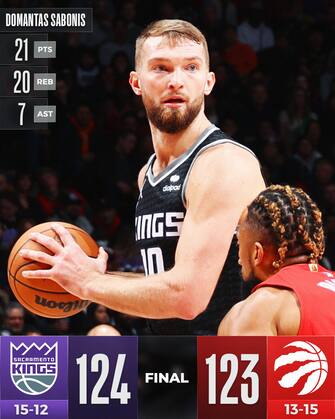 TORONTO RAPTORS-SACRAMENTO KINGS 123-124 | De’Aaron Fox chiude in doppia doppia da 27 punti e 10 assist, Domantas Sabonis ne aggiunge 21 con 20 rimbalzi e Sacramento si prende anche un meritato successo in volata a Toronto, tentando ben 46 conclusioni con i piedi oltre l’arco (record stagionale) e mandandone a bersaglio ben 17 - merito dei sei giocatori in doppia cifra. Per i Kings è una vittoria che vale il sesto posto virtuale a Ovest, un ritorno al successo dopo tre sconfitte nelle ultime quattro gare