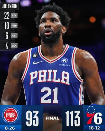 PHILADELPHIA 76ERS-DETROIT PISTONS 113-93 | Sesta vittoria in fila per i Sixers che approfittano di una serata in cui tutti trovano il fondo della retina - 22 punti e 10 rimbalzi per Joel Embiid, 17 realizzati da Harris, 15 da Harden - per sbarazzarsi senza grossi problemi dei Pistons, con Detroit che invece subisce così il settimo ko delle ultime otto e sprofonda sempre più all’ultimo posto della Eastern Conference (16 punti di Jaden Ivey, 12 di Killian Hayes e 11 per Saddiq Bey)