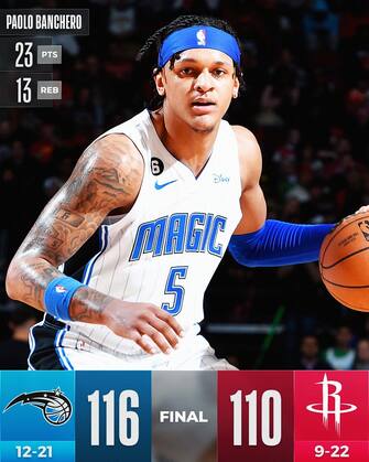 Doppia doppia decisiva da parte di Paolo Banchero, autore di 23 punti e 13 rimbalzi nella settima vittoria raccolta da Orlando nelle ultime otto gare - determinante anche con un super canestro nel finale della sfida conquistata con merito a Houston. Il n°5 Magic di passaporto italiano raccoglie così la 20^ prestazione in stagione da almeno 20 punti su 26 partite NBA giocate finora in carriera: gli ultimi due rookie a mettere insieme cifre del genere sono stati Zion Williamson e Michael Jordan - non può esserci auspicio migliore per la sua carriera