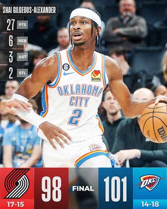 OKLAHOMA CITY THUNDER-PORTLAND TRAIL BLAZERS 101-98 | Si ritrovano davanti OKC e Portland per la seconda volta in tre giorni e a recitare da protagonista è ancora Shai Gilgeous-Alexander, top scorer dell'incontro a quota 27 (con 6 rimbalzi, 3 assist e 2 recuperi) due giorni dopo aver segnato il canestro della vittoria sulla sirena. Terzo successo consecutivo per i Thunder, mentre i Blazers contano la pessima serata a tiro sia di Lillard (6/19) che di Simons (4/11): il migliore per Portland è Jerami Grant a quota 17 punti