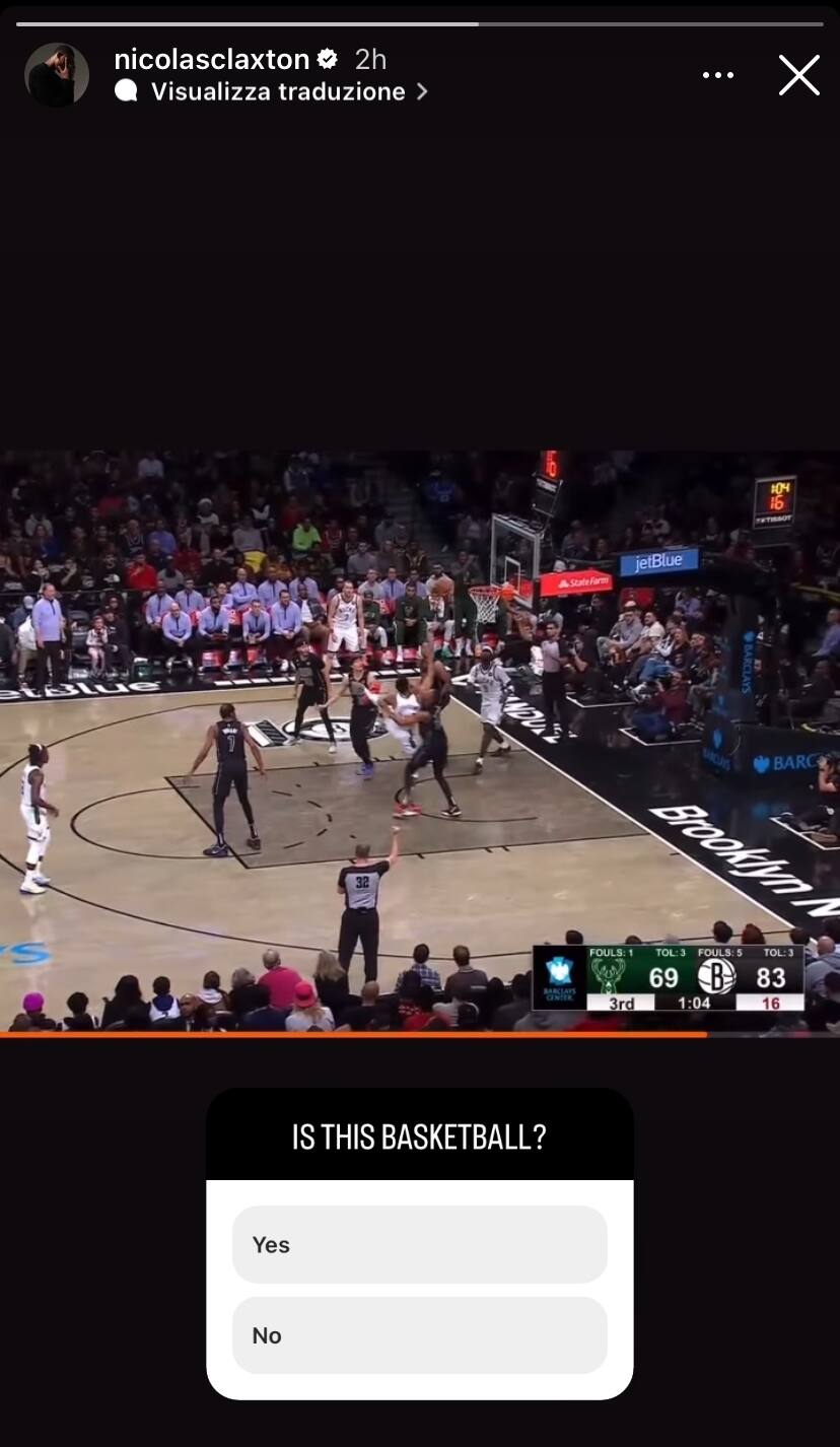 Due gli episodi che hanno fatto discutere, il primo dei quali arrivato a metà secondo quarto, quando su una palla persa Bucks Claxton si è lanciato verso il canestro avversario andando a schiacciare con forza e dicendo poi qualche parola di troppo a Giannis Antetokounmpo - finito faccia a faccia con lui mentre gli allenatori chiamavano timeout. Nella ripresa invece ci ha pensato il giocatore Bucks a restituirgli il favore, colpendolo al termine di una penetrazione a gioco fermo: episodio che ha portato il giocatore dei Nets a ripostare l’episodio sui social e lanciare il sondaggio chiedendo - “Secondo voi è pallacanestro questa?”. Al momento il “no” sta vincendo con il 69% dei voti, ma il dato importante è che la tensione tra le due squadre resterà sicuramente alta anche al termine del sondaggio.
