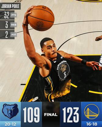 Gli Warriors vincono contro i Grizzlies grazie ai 32 punti di Jordan Poole (poi espulso) e ai 24 di Klay Thompson, mentre sono 36 quelli raccolti da Ja Morant. Tripla doppia da 41-15-15 per Nikola Jokic nella vittoria all'OT in rimonta di Denver contro Phoenix, Joel Embiid domina a New York e Philadelphia fa otto in fila. Doncic&Wood travolgono i Lakers con un super terzo quarto da 51 punti e condannano LeBron James al ko (38 punti), Jayson Tatum ne segna 41 nel successo Celtics sui Bucks