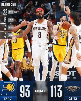 NEW ORLEANS PELICANS-INDIANA PACERS 113-93 | Pur senza Zion Williamson, Ingram, Herb Jones e Nance i Pelicans non hanno problemi a superare i Pacers, grazie alla presenza di McCollum (19 punti) e Valanciunas (20+12 rimbalzi, con anche 5 assist) ma anche alla super prestazione di Naji Marshall, autore di 22 punti con 8/14 al tiro. Ben 30 gli assist su 41 canestri segnati per gli uomini di Willie Green. Mathurin dalla panchina con 15 punti è il migliore per Indiana