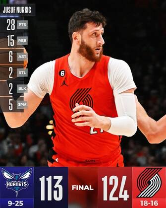 PORTLAND TRAIL BLAZERS-CHARLOTTE HORNETS 124-113 | Un secondo tempo da 63-46 per i padroni di casa decide la gara, segnata dal dominio dei big di Portland. Grant è protagonista, ma Jusuf Nurkic manda a referto una gara da 28 punti, 15 rimbalzi, 6 assist, 2 stoppate e 2 recuperi stabilendo anche il suo massimo in carriera con 5 triple a segno (5/7 per lui dall'arco, nella serata in cui Lillard fa 1/10 dalla lunga distanza, la sua specialità). Agli Hornets non bastano i 27 punti di LaMelo Ball e i 22 di P.J. Washington: Portland torna a vincere dopo 3 ko consecutivi