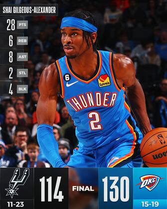 OKLAHOMA CITY THUNDER-SAN ANTONIO SPURS 130-114 | Si chiude con un successo la striscia di sette gare casalinghe dei Thunder, guidati neanche a dirlo dai 28 punti, 8 assist, 6 rimbalzi e 4 stoppate di Shai Gilgeous-Alexander, a cui si aggiungono altri quattro giocatori in doppia cifra con OKC che resta in vantaggio per tutti gli ultimi 46 minuti di gara, ma ha bisogno di un 14-3 di parziale a inizio quarto periodo per scrollarsi di dosso gli Spurs - col quintetto tutto in doppia cifra e incapaci di andare oltre i 20 punti firmati da Devin Vassell