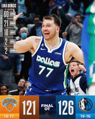 Il miracolo di Doncic alla fine dei regolamentari è solo la punta di un iceberg mai visto prima nella storia NBA, con una tripla doppia da 60 punti (massimo in carriera), 21 rimbalzi (anche questo career high) e 10 assist che mai nessuno aveva realizzato. “Sono stanco da morire, ho bisogno di una birra per recuperare” ha detto sorridendo al termine del match, che ha chiuso con 21/31 al tiro (2/6 da tre) e 16/22 ai liberi, accompagnato dai 25 di Spencer Dinwiddie e i 19 di Christian Wood