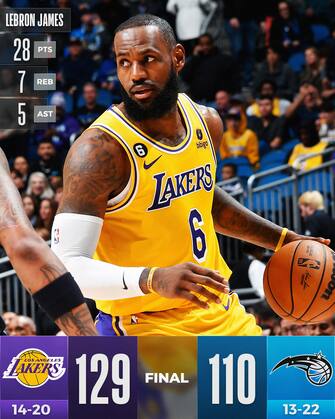 ORLANDO MAGIC-LOS ANGELES LAKERS 110-129 | Tornano al successo i Lakers che dopo 4 ko in fila trovano la forza per battere a domicilio i Magic - reduci da settimane ottime a livello di risultati, ma travolti dai 28 punti con 12/24 dal campo (ma senza bersagli dall’arco, 0/7), 7 rimbalzi e 5 assist di LeBron James, che interrompe la striscia di gare da 30+ punti a quota sette e che mette alle corde un Paolo Banchero in enorme affanno offensivo e limitato dai falli nel provare a contenere il n°6 gialloviola