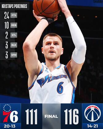 WASHINGTON WIZARDS-PHILADELPHIA 76ERS 116-111 | Si ferma a otto la striscia di vittoria dei Sixers, naufragati sul più bello a Washington che lancia un messaggio grazie ai 19 punti realizzati da Bradley Beal (fuori negli ultimi 5 minuti a causa di un fastidio alla coscia che si spera sia soltanto un lieve infortunio) e ai 24 di Kristaps Porzingis con 10 rimbalzi e 7/15 al tiro: gli Wizards infatti mettono in fila il quarto successo, arrivato conto un altro avversario da playoff dopo le vittoria con Phoenix e Sacramento
