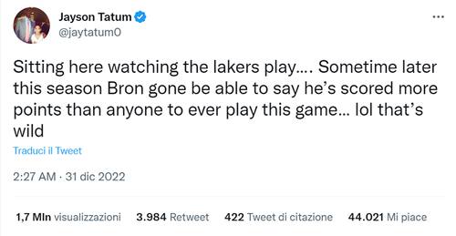 JAYSON TATUM | "Sono qui seduto che mi sto guardando la partita dei Lakers", racconta la superstar dei Boston Celtics. "E a un certo punto, quest'anno, LeBron potrà dire di aver segnato più punti di tutti nella storia di questa lega. LOL, è qualcosa di pazzesco", commenta Tatum proiettandosi già al giorno in cui il Re batterà il record storico di Jabbar