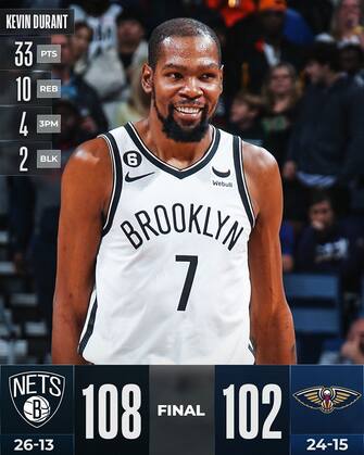 NEW ORLEANS PELICANS-BROOKLYN NETS 102-108 | C’è una brutta notizia per il resto della NBA: anche in una serata in cui Durant e Irving sbagliano 32 tiri su 48, i Nets hanno abbastanza consistenza difensiva per darsi una chance e rimontare da -15 sul campo di una delle migliori squadre della lega (seppur priva di Zion Williamson e Brandon Ingram). Ai Pelicans non bastano i 28 punti di CJ McCollum e il massimo in carriera da 23 di Naji Marshall per evitare il quinto ko interno della stagione, puniti nel finale da una tripla di Irving