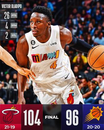 PHOENIX SUNS-MIAMI HEAT 96-104 | Settimo ko nelle ultime otto per i Suns, che già privi di Booker e Cam Johnson devono fare a meno anche di Chris Paul dopo 12 minuti (problemi all'anca destra). Si aggrappano allora a Ayton, autore di 23 punti e 14 rimbalzi, ma non basta, perché Miami trova un protagonista a sorpresa: è Victor Oladipo infatti il top scorer degli Heat a quota 26 (con 7/10 al tiro e 4/6 da tre in uscita dalla panchina), mentre 21 con 11 rimbalzi li aggiunge Adebayo e 20 con solo 9 tiri Butler