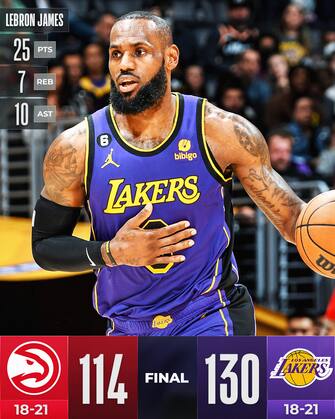 Trascinati da LeBron James, i Lakers battono gli Hawks e per la prima volta in stagione mettono in fila 4 vittorie. Sono invece 5 i ko consecutivi dei Clippers e 6 nelle ultime 7 quelli dei Suns, battuti in casa da Miami. Antetokounmpo viene tenuto sotto i 10 punti in una serata da record per Charlotte, mentre Jokic firma l'ennesima tripla doppia e Denver batte anche Cleveland. Cadono in casa Sixers, Raptors e Pelicans, battuti dai Nets che tornano al successo