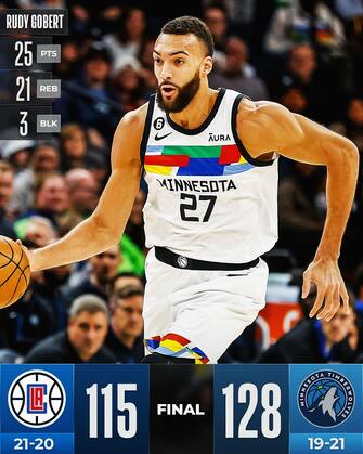 MINNESOTA TIMBERWOLVES-L.A. CLIPPERS 125-109 | Terzo successo in fila per i T’Wolves, che pur perdendo Anthony Edwards nel terzo quarto per un infortunio all’anca, dominano i Clippers privi di Paul George e Kawhi Leonard. La squadra di coach Lue crolla nella ripresa sotto i colpi di un Rudy Gobert da 25 punti e 21 rimbalzi, accompagnato dai 25 di D’Angelo Russell e i 18 di Jaden McDaniels toccando anche il +25 e infliggendo a L.A. la quinta sconfitta consecutiva, nonostante i 21 punti di Norman Powell e altri sei in doppia cifra